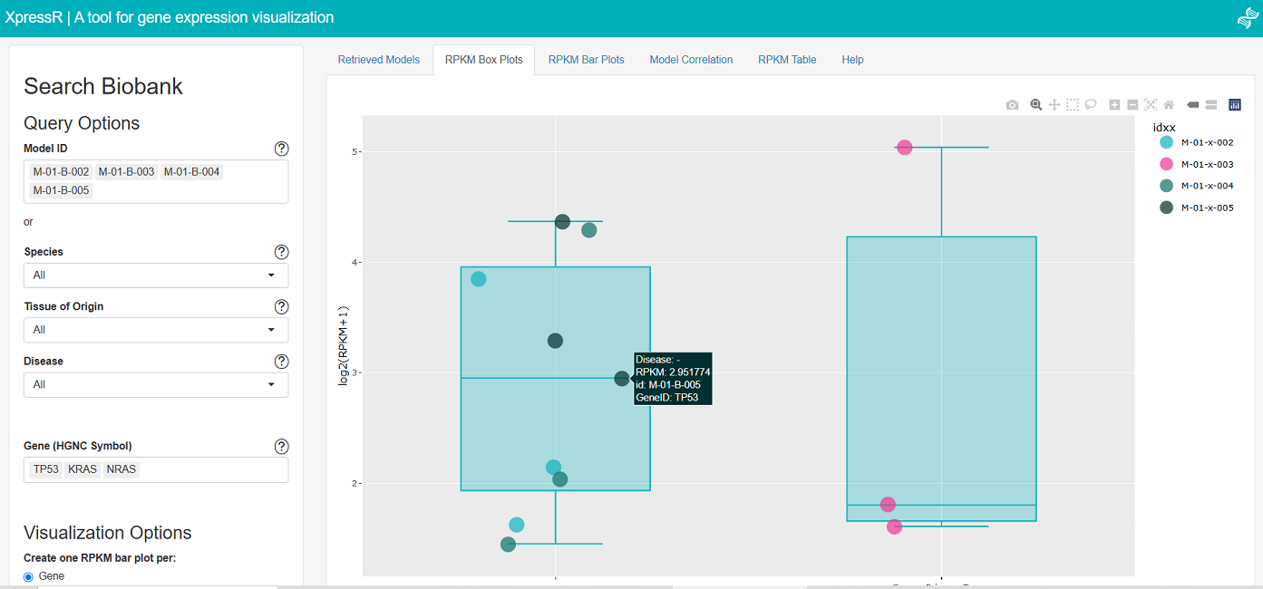 ✔ Interactive boxplots with RPKM values per model, coloured by group